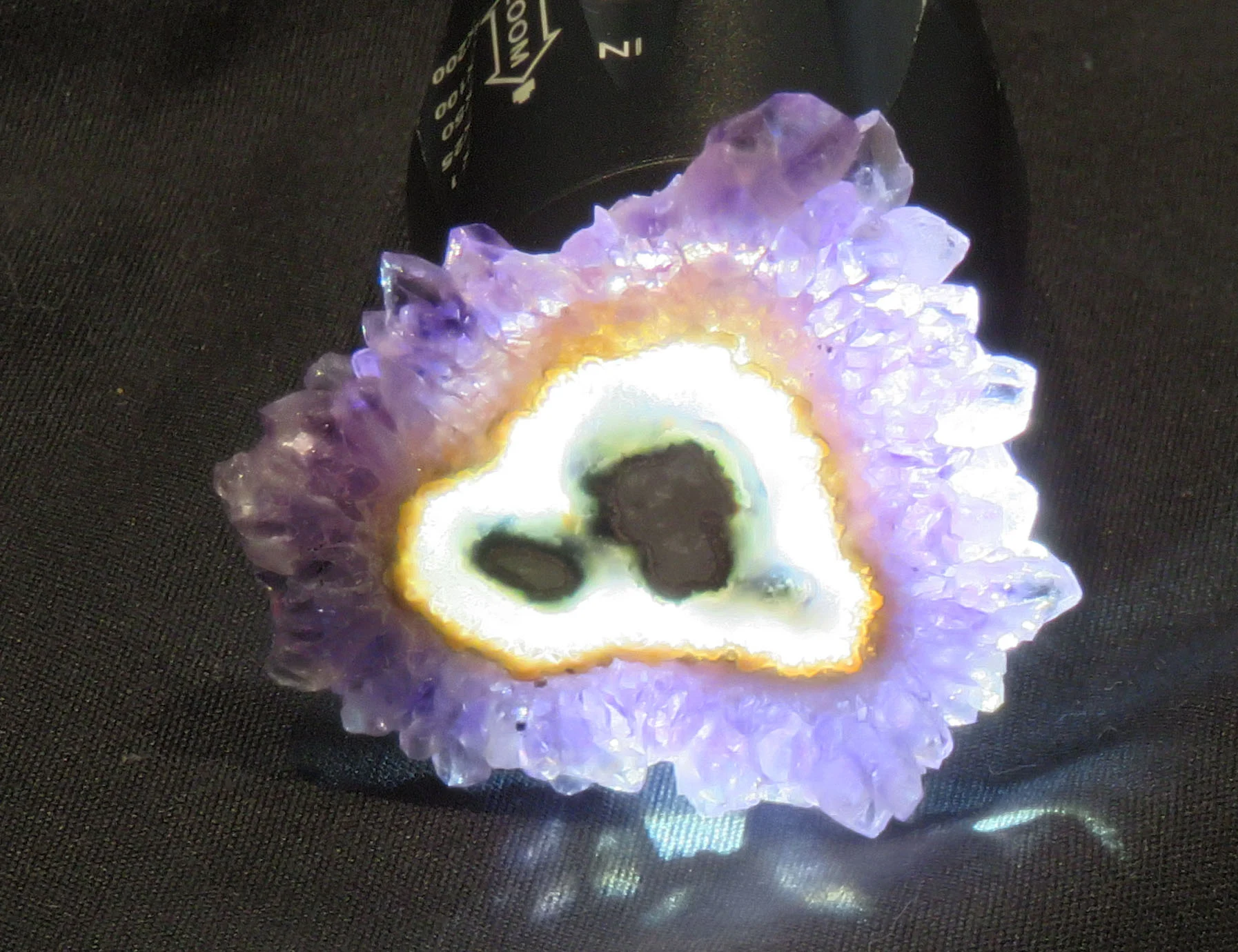 Slice through an Amethyst stalagtite/mite with zoned core. Uruguay, 4.5 x 4.5 x 0.03 cm