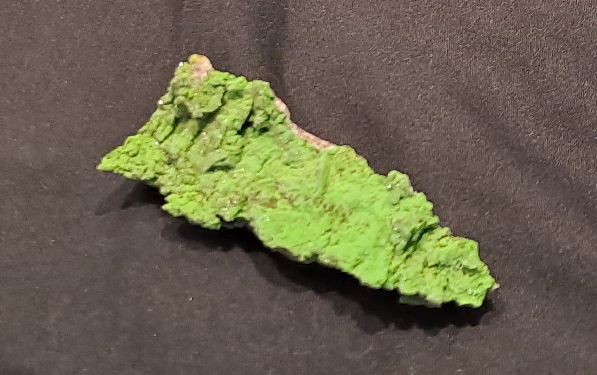 Matrix covered in a layer of bright green Duftite crystals. Tsumeb Mine, Namibia. 8.5 x 3 x 2 cm