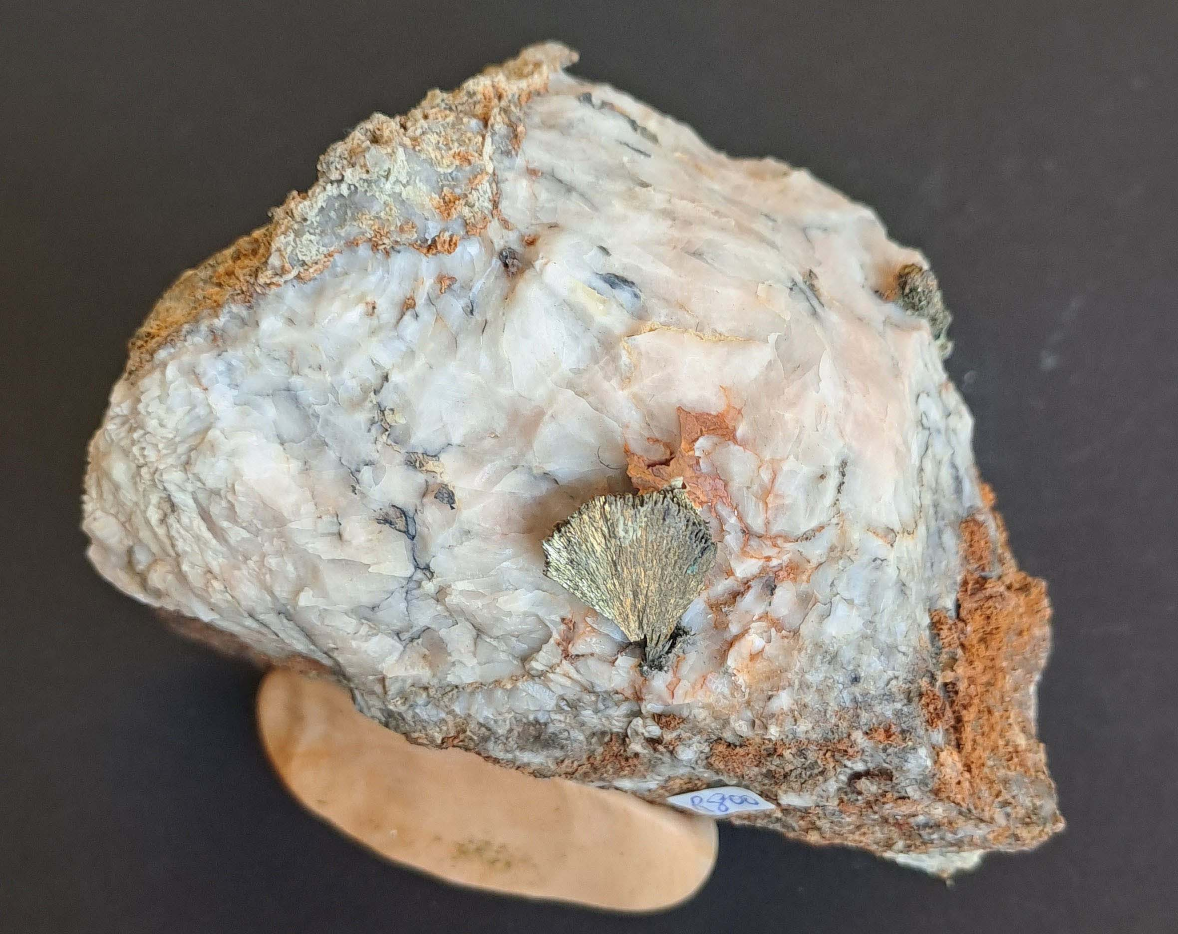 Millerite. Spray of brassy crystals of this rare mineral on off-white massive calcite matrix. From the famous occurrence at Pafuri, Limpopo Province, South Africa.