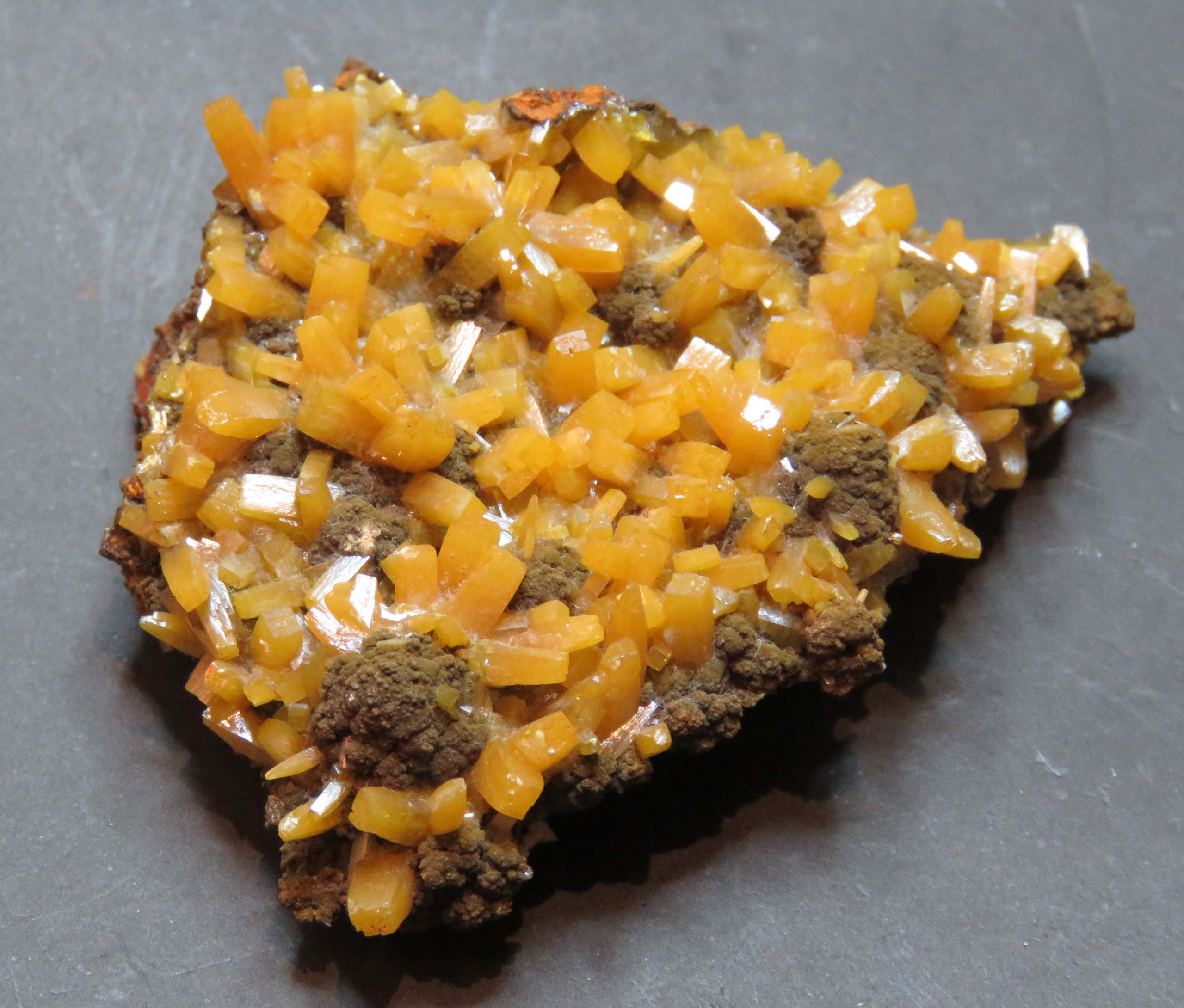 Yellow Wulfenite crystals spread thickly on matrix with botryoidal green mimetite, from the Ojuela Mine, Mexico